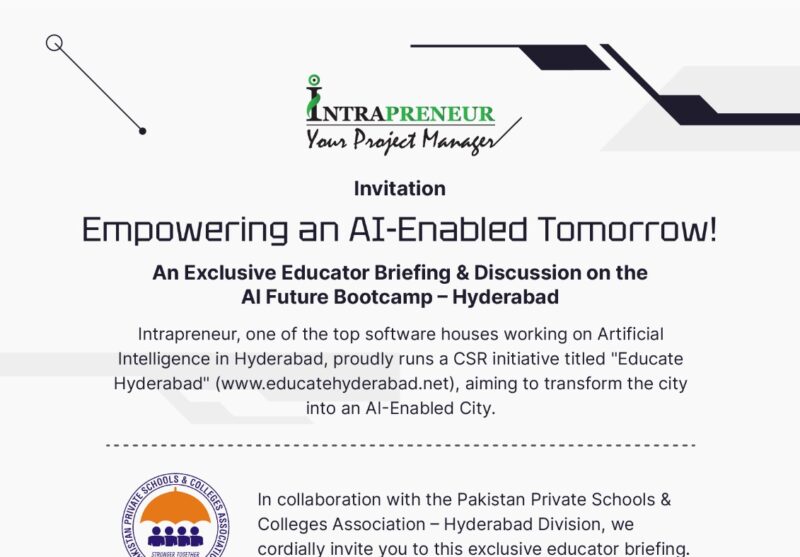 We conducted an awareness session on the Future AI Bootcamp roadmap for management from private schools and colleges across Hyderabad. Part of EducateHyderabad.net, a CSR initiative by intrapreneur.pk, supporting the vision of an AI-enabled city. Alhamd-u-Lillah!